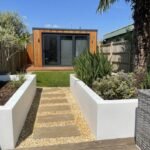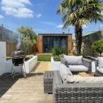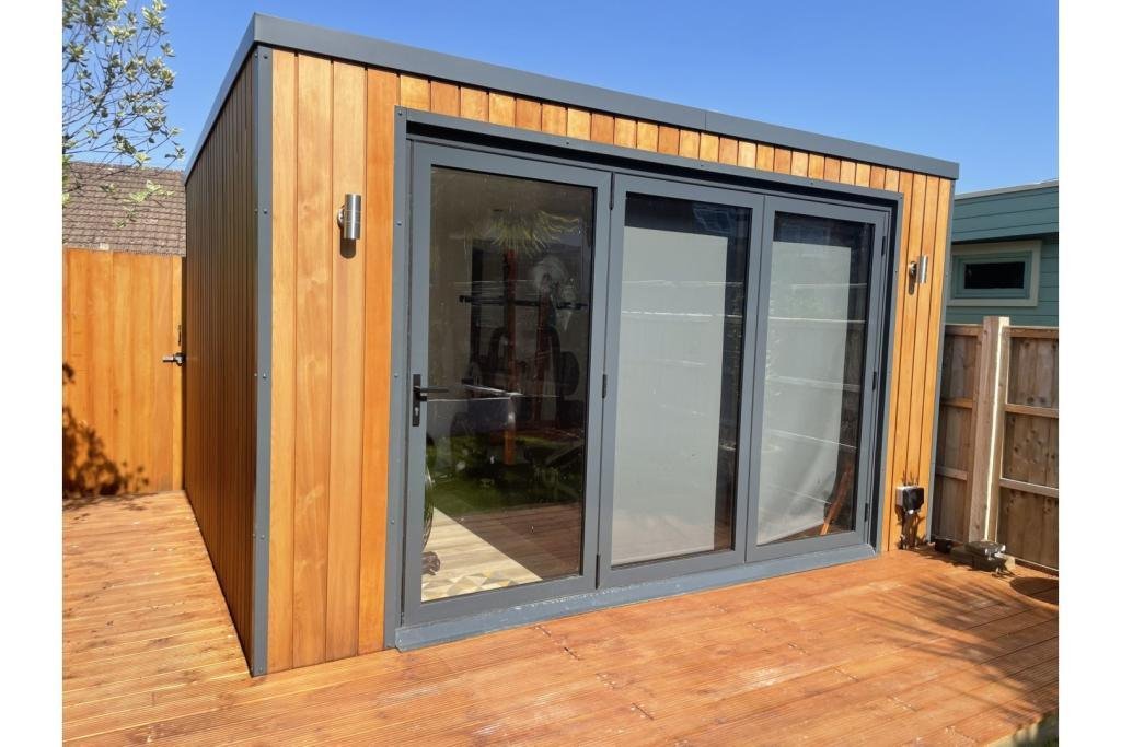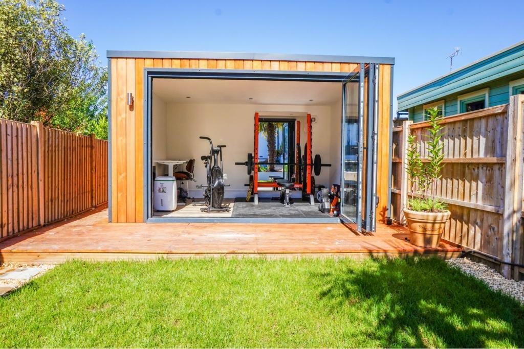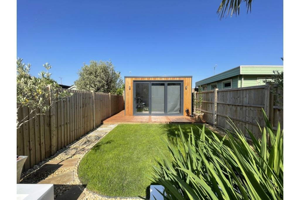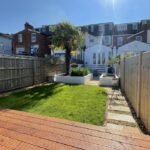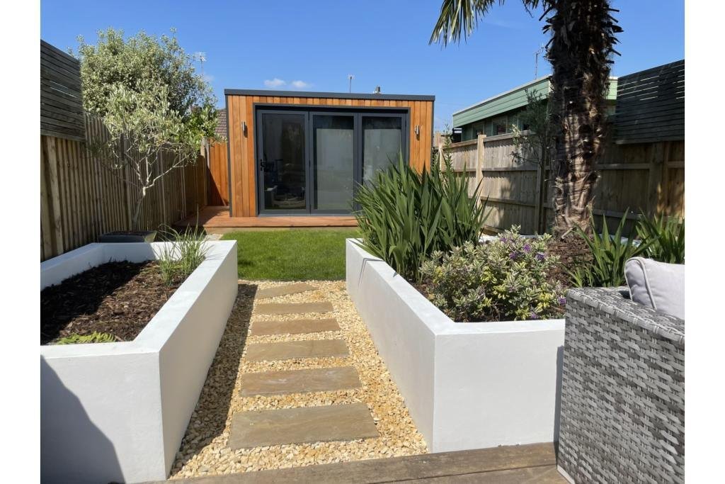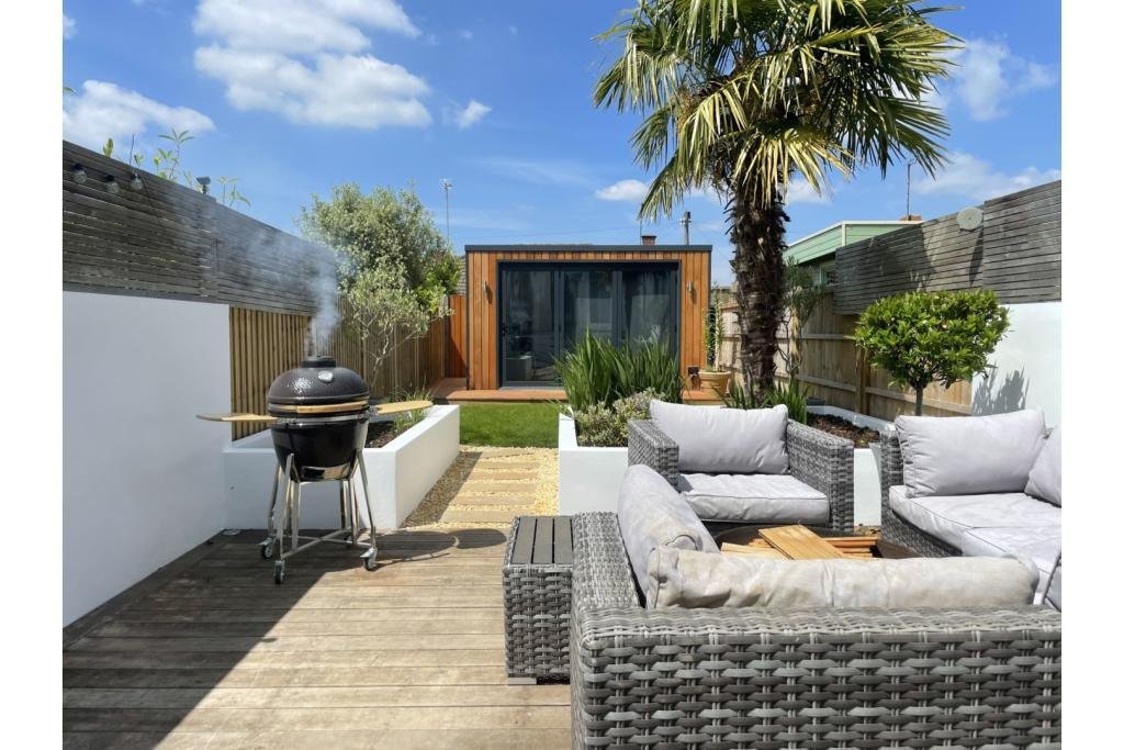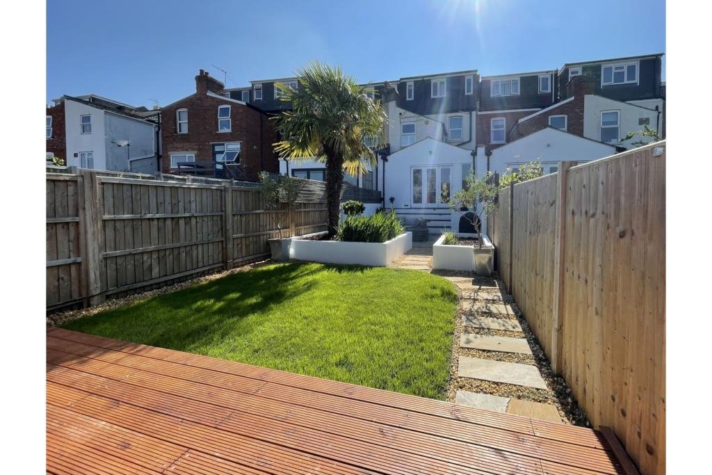 Outside to the rear is steps to a large 4m x 5m decked area and the newly landscaped garden, including fixed planters, a palm tree and lawn area with pathway leading to the new cedar-clad home office/garden room with its bi-fold doors and decked surround. There is a gate for rear-access via a secure alleyway shared with neighbours.