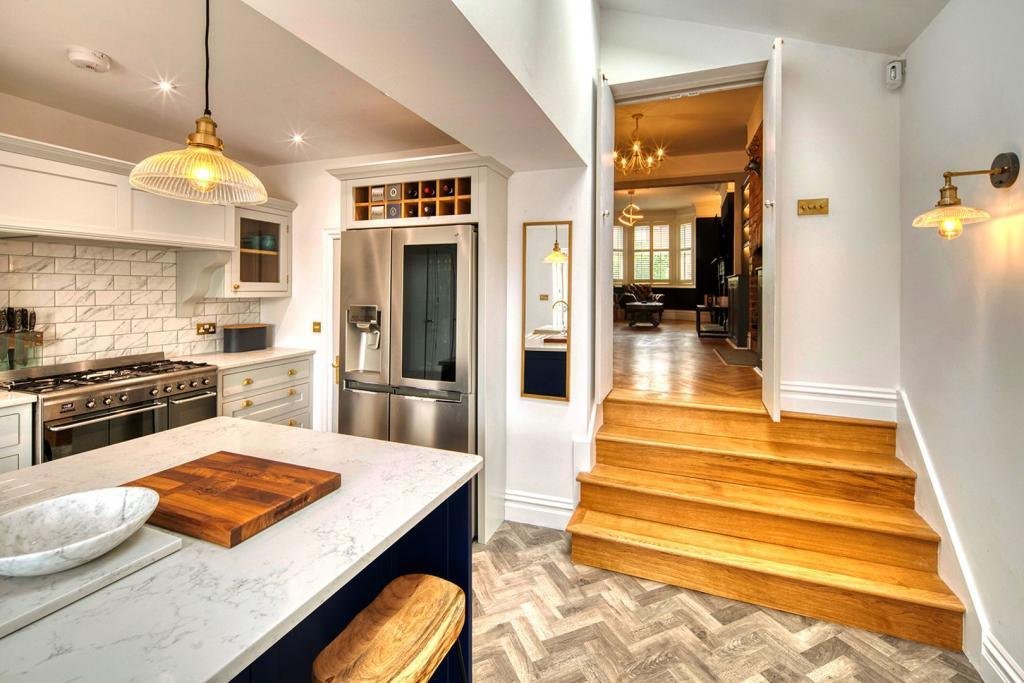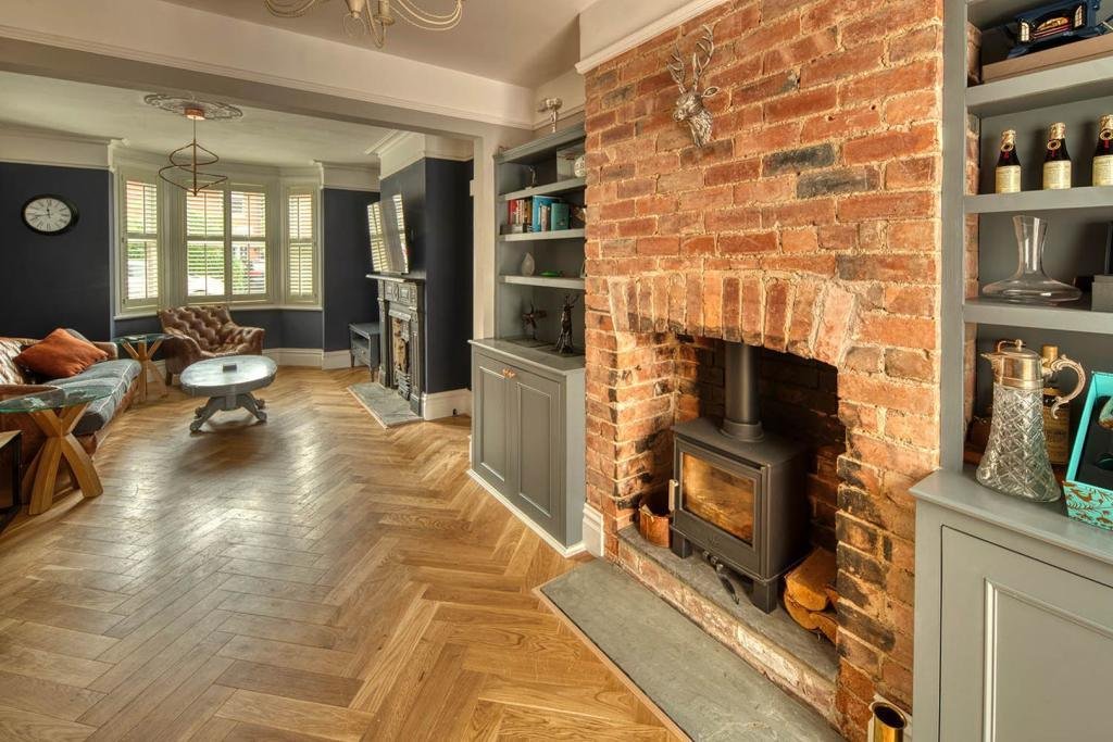 This Edwardian three double bedroom home comprises on the ground floor of a bright entrance hall with door to the new character w/c with high level cistern. The large open-plan lounge/diner, which boasts a bay window and two feature fireplaces, one with a wood burning stove, and has hardwood flooring throughout. Down three steps you are lead into the new Jamie Knight bespoke kitchen which boasts a large island with solid worktops, double larder cupboard, range cooker and American fridge/freezer. The room also benefits from skylights, utility cupboard and bi-fold doors to the garden .